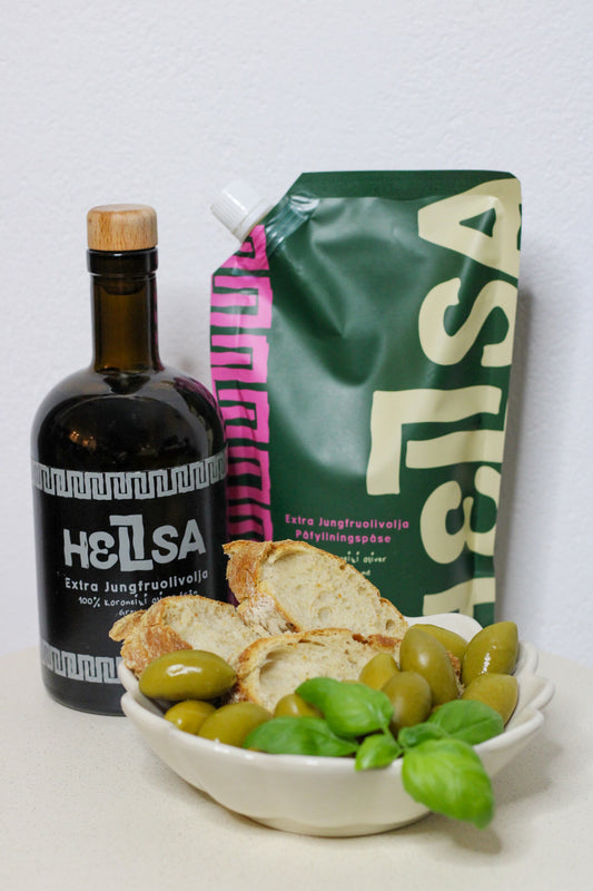 ALDRIG! Vi levererar bara den färskaste extra jungfruolivoljan. Tyvärr är det vanligt i branschen att blanda gammal och ny olja – eller olja från olika länder. Vi gör inte så. HELLSAs olivolja är alltid single origin och aldrig utblandad eller blandad mellan årgångar.