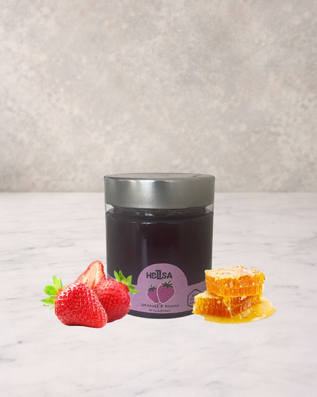Handgjord fruktspread med jordgubb och honung. Naturliga ingredienser utan tillsatser. Perfekt på yoghurt, rostat bröd eller ostbrickan.